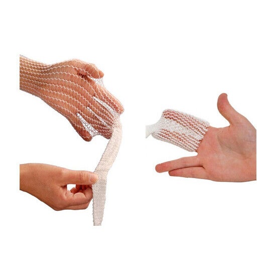 - Wijdmazig, rondgebreid en rafelvrij fixeerverband van 58% katoen, 25% rubber omsponnen met polyamide en 17% rubber.